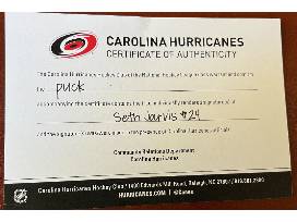 Authentic Official Game Puck Autographed by Carolina Hurricanes player, #24 Seth Jarvis.