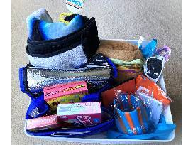 The gift basket also includes a ton of fun stuff, from candy and a cooler to sunglasses, a towel, and more.