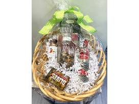 In this basket you will find a bottle of Smirnoff Vodka, a jar of olives and hot peppers, Bloody Mary Mix Spice Blend, Chocolate Martini mix in a decanter, plus Tuscan crisp crackers and cocktail napkins.