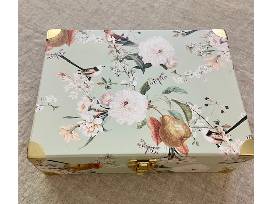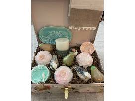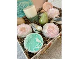 2 round bird soaps, a pear scented candle, a handmade trinket dish and a linen hand towel.