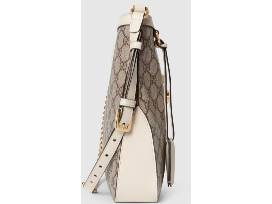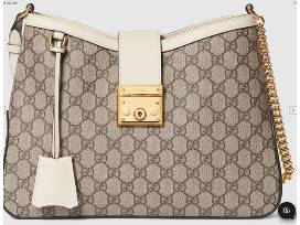 Drawing from the House's origins as an artisanal luggage atelier, the Padlock closure features prominently on this shoulder bag in GG Supreme canvas. It is complete with gold-toned hardware, smooth white leather trim, a chain and leather shoulder strap.