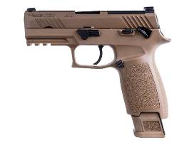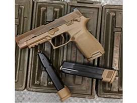 The P320-M17 is a 9mm, striker-fired pistol and comes with one (1) 17-round magazine and two (2) 21-round magazines. The pistol features a coyote-tan PVD coated stainless steel slide with the same optic cut as specified by the MHS …