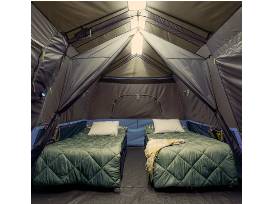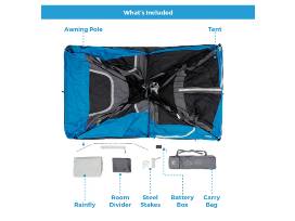 WHAT'S IN THE BAG: Includes tent with pre-attached poles, rainfly with attached guylines, room divider, battery compartment (4D batteries not included), tent stakes, and carry bag.