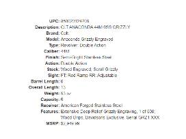 Features: Extensive Deep Relief Grizzly Engraving, 1 of 500; Wood Grips, Davidsons Exclusive, Serial GRZ1-XXX
