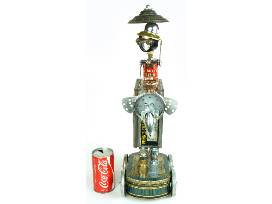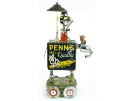 Found Object Robot composed of authentic vintage parts, including a tobacco tin, spice tin, pressure gauges, sash lock, tea ball, lamp caps, hose fittings, screen door closer, bolo tie ends, oil lamp burner, steamer fins, candy tin, and erector set wheels. Jumbo #5 (a play on "Mambo #5") opens so you can see his heart inside.