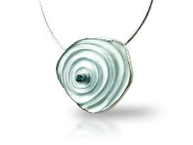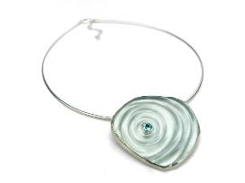 A necklace made of hand-constructed sterling silver, carved/cold-worked glass, and genuine topaz inspired by the ripples in water generated by a single drop. The piece is one of a kind, signed and copyrighted. A sterling silver adjustable omega chain is included.