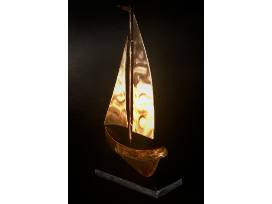 A little sail boat, cast in bronze with a reflective finish and rich patina, on a black granite base.