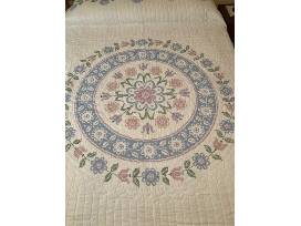 The central medallion is meticulously cross-stitched and encircled with cross-stitched flowers.