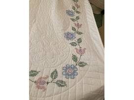 The quilt is bordered by a string of cross-stitched flowers and the corners have quilted medallion accents.