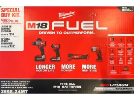 This combo kit fits all M18 batteries and includes a hammer drill/driver, impact driver, multi-too, light, high output CP3 battery, high output XC6 battery, M18 & M12 charger, sanding pad, 5 sanding sheets, wood cutting blade and a contractor bag.