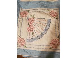 This 88" x 103" vintage quilt was hand-quilted and embroidered by the St. Joseph Quilters and purchased by the late Carol Engelbach at one of St. Joseph's Fall Festival Auctions. It still had the original item number (27) on it!