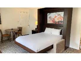 This 350 square foot room has a queen Murphy bed, TV, Wi-Fi, full bath with hairdryer and towels, stocked mini kitchen with small stove top, small refrigerator, and coffee maker, and small washer/dryer with laundry soap in room.