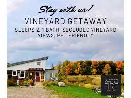 Our accommodations feature a queen bed, a private bath, an efficiency kitchen, and a comfortable sitting area. You'll also have access to our deck overlooking the vineyard-a shared space with our tasting room during business hours-but exclusively yours after hours. It's the perfect place to enjoy some peaceful wildlife watching. We will send you home with your favourite bottle of WaterFire!