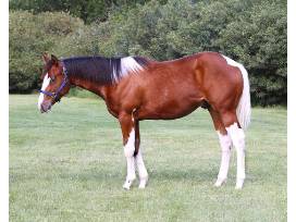 Simon Says Im A Star "Simon" is a flashy 2023 bay tobiano gelding. He is sired by John Simon and out of Pass the Iron Star. Simon was bred to be a rockstar! His sire is a 15-time APHA World Champion, 9-time APHA Reserve World Champion, 2-time NSBA World Champion, and NSBA Reserve Champion in Western Pleasure. Numerous progeny have gone on to claim World and Reserve World champion titles as well. Many owners of John Simon's offspring have remarked how kind and easy-going they are, and this yearling is no exception. Simon's sense of loyalty and willingness to please will make him a hard working companion for his future owner. His dam's sire, Iron Star Man, is a 3-time APHA World Champion, 4-time Reserve World Champion, 14-time PtHA World Champion, and 8-time PtHA Reserve World Champion in both English and Western events. With his great build, winning genetics, and positive attitude, Simon has amazing potential as a new show horse prospect or even a trail or lesson horse. His trainer's favorite thing about him is his loving and friendly personality. Full Disclosure: On February 21, 2024, Simon underwent surgery to repair an OCD lesion on his right hock. The surgery and recovery went exceedingly well, and this condition is not expected to impact his future performance. For more information, contact the Horse Barn manager.