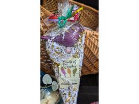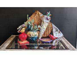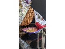 1These four unique clay bird pieces by local artists Zeber & Martell will bring color and spark joy. This basket includes two display items, a small dish, and an ornament that can added to a potted plant.