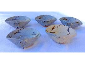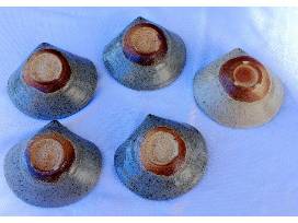 Set of five ceramic dishes. Made by Kenta Nakazato. Gray/tan with brown speckles and leaf design. Dishes vary slightly in size: smallest approx. 12.7 x 14.9 x 5 cm (5 x 5.9 x 2 in); largest approx. 13.4 x 15.9 x 5.7 cm (5.25 x 6.25 x 2.25 in).