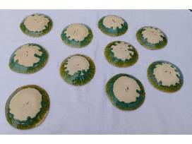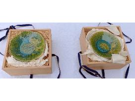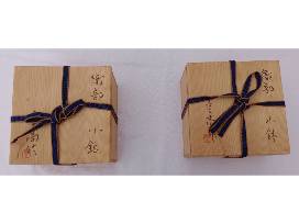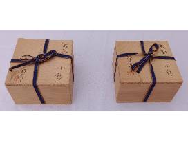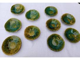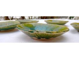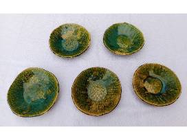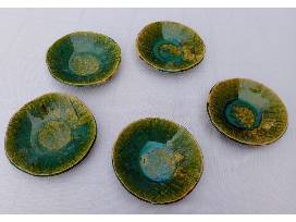 Writing on box: "Oribe kobachi Shigetaka saku." Blue-green ceramic dishes. Set of 5 in two boxes (10 total). Approx. 14.6 x 3.2 cm (5.75 x 1.25 in). Comes with wooden boxes.