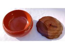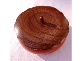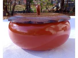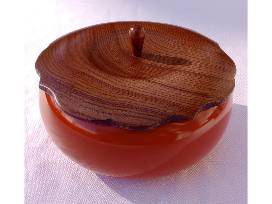Orange/red wooden persimmon box with cherry wood lid. Approx. 16.5 x 12.7 cm (6.5 x 5 in) (with lid).