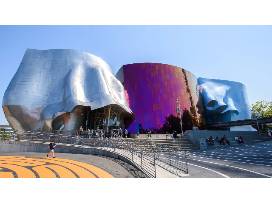 The Museum of Pop Culture's mission is to make creative expression a life-changing force by offering experiences that inspire and connect our communities. A fusion of textures and myriad colors, MoPOP's exterior conveys all the energy and fluidity of music. Three thousand panels, made up of 21 thousand individually cut and shaped stainless steel and painted aluminum shingles, encase the outside of the building. Their individual finishes respond to different light conditions and appear to change when viewed from different angles, reminding audiences that music and culture are constantly evolving.