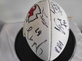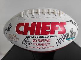 This one-of-a-kind collector's item showcases an impressive array of signatures from fan-favorites like Travis Kelce, along with those of team owner, coaches, and the legendary voice of the Chiefs.