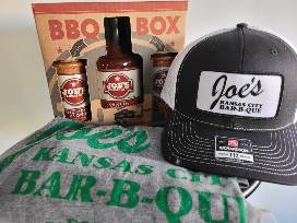 This Joe's Kansas City BBQ Bundle features a $100 gift card, a set of signature BBQ sauces, and a branded t-shirt (L) & trucker hat-perfect for fans of authentic Kansas City barbecue.