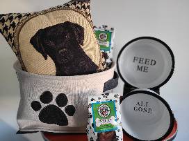Celebrate your love for home and your furry friend with this charming set: a classic Houndstooth Lab pillow, a paw-print toy basket for all your pet's favorites, stylish enameled pet dishes, and delicious dog treats lovingly made by The Farmer's House students.