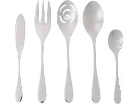 This set includes a Serving Meat Knork (8.5"), a Serving Spoon (8.5"), a Slotted Spoon (8.5"), a Butter Knife (7.4"), and a Sugar Spoon (6.25").
