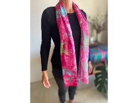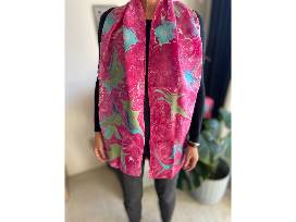 This beautiful 100% silk scarf was hand-dyed by Holden co-Director Stacy Kitahata, who utilized the Japanese Suminagashi ("floating ink") technique to create vibrant and dynamic swirls of raspberry, teal and green.