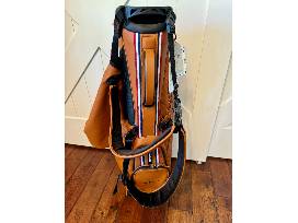 - G/Fore leather camel colored golf bag with red, white, and blue stripe