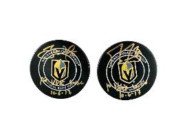 Calling all Knights fans! Here's your chance to own a unique pair of autographed hockey pucks from the Inaugural 2017-2018 VGK season. This special set features the signatures of Marc-Andre Fleury and James Neal.