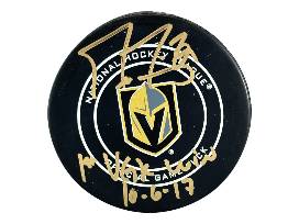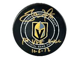 On October 1, 2017, in the VGK's first regular-season game against the Dallas Stars, Fleury clinched the victory while Neal scored the team's inaugural goal. Both players have inscribed these historic stats on their respective pucks alongside their autographs.