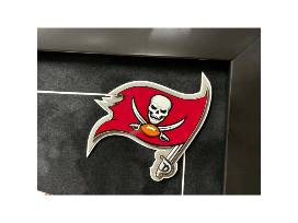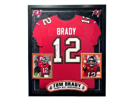 Professionally museum-quality custom framing enhances this piece, featuring a black frame with suede matting, a plexiglass display, laser-cut Buccaneers logos, a nameplate, and two 8x10 photos. Dimensions are approximately 40"" x 43"" x 2"". If you seek top-tier framing for your jersey, look no further-unrivaled quality from materials to design, guaranteed!