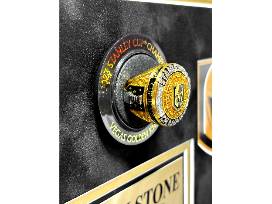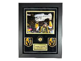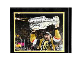 Celebrate the greatest moment in Vegas Golden Knights history with this exclusive Mark Stone signed collage. This stunning piece features a replica Stanley Cup Vegas Golden Knights championship ring alongside an 8x10 photo of Mark proudly holding the trophy. Perfect for any VGK fan's man cave, game room, office, or special space!