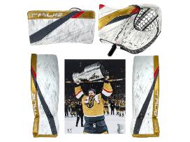 1Own a piece of hockey history with this complete goalie pad set used by Adin Hill during the 2022-23 Stanley Cup-winning season! Hill utilized these pads, blocker, and glove in 8 out of 27 games played, roughly one-third of the entire season from November 5, 2022, to January 27, 2023. This is an amazing set of memorabilia to own for any and all Knights fans that is sure to shine in the man cave, game room, lady lair or office!