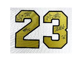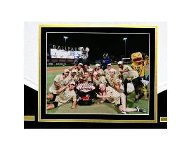 This item is professionally museum quality custom framed in a black frame that features suede matting throughout as well as a plexiglass display, laser cut team logos and lettering and an 11" x 14" Photo. This frame measures approximately 40" x 43" x 2".