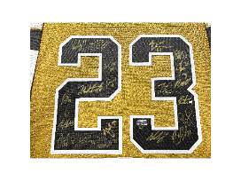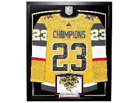 Commeorate the Knights' Stanley Cup win with this Gold CHAMPIONS jersey signed by 21 members of the team including Stone, Karlsson, McNabb, Theodore, Barbashev, Hague, Smith, Martinez, Carrier, Brossoit, Roy, Howden, Pachal, Thompson, Coach Cassidy, Stephenson, Quick & more! This jersey is limited edition out of only 3 ever signed like this! Gold is also the same jersey color they won the cup in!