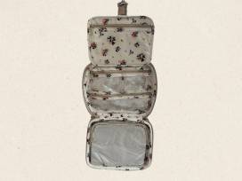 In water-repellent performance twill, your favorite hanging organizer can now easily handle a few spills and splashes. With its handy tuck-away metal hanger and smooth-glide zippers, your essentials are all conveniently within reach. Hang from a door hook or towel rack. Two quilted compartments conceal personal items, while two clear plastic compartments reveal your most-used essentials. This one's not just for travel, though ... it's just too organized and pretty not to use at home.