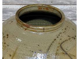 Large Jar w/ Honey Amber Glaze. Made by Travis Owens w/ additional decoration by Pam Owens. Bottom Drain Hole. 25" H x 21.25" Dia.