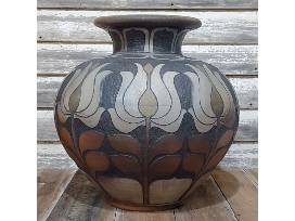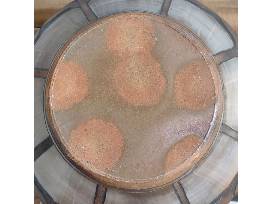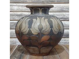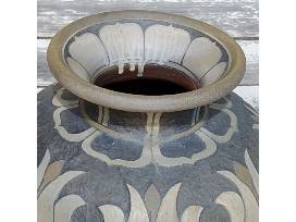 "Midnight Lotus." Wheel-thrown and decorated with a hand carved Lotus motif. Woodfired. 21.5" "H x 22" Dia. Donated by Kate Waltman, The Triangle Studio, Seagrove, NC.