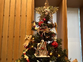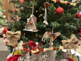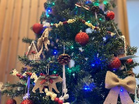 Nestled in the heart of a snow-dusted forest, the rustic Christmas tree stands as a living testament to nature's quiet beauty. Its thick branches are speckled with warm white lights that glisten like ice crystals on a snowy winter's day. The deep green needles are contrasted by the vibrant pop of red ball ornaments that gleam like the berries against the forest backdrop. Rustic burlap bows and popcorn with cranberry garland help decorate the tree, adding an earthy, homespun charm, while delicate pinecones adorned with white ribbon and jingle bells rest nestled in the branches. Tiny wooden forest creature ornaments hang like forgotten treasures, each one telling a story of seasons past, along with a few cozy little winter cabins that makes you think of sitting by the fireplace enjoying a nice cup of hot cocoa. This tree doesn't just stand -it lives! A part of the woodland's soul, whispering stories of the forest and the magic of a Christmas spent among the trees.