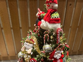 What's better than snowmen and candy canes during the Holidays!!! This petite tree is all ready to display in your home. Perfect for a den or child's room, this tree has homespun style ornaments and plenty of candy canes!
