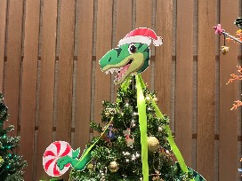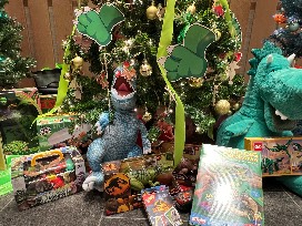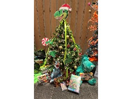This petite Dinosaur-themed tree is decorated with adorable dino ornaments and there are lots of dino themed presents under the tree for your favorite dino fan.