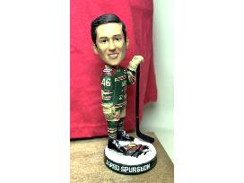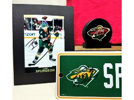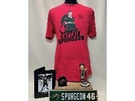 Support your Wild team captain with this package perfect for any true fan or collector. This bundle features a Captain Spurgeon SotaStick t-shirt (adult XL), 78's style Spurgeon Nameplate, Minnesota Wild Hockey Puck, 5x7" player card, and Winter Classic Spurgeon Bobblehead all autographed by the esteemed team captain himself, #46 Jared Spurgeon.