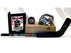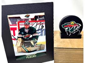 Harness the power of the flower when you bid on this collection of #29 Marc-Andre Fleury signed items. This package features a Minnesota Wild mini goalie helmet, mini goalie stick, hockey puck, and 5x7" player card all signed by the future hall of famer himself.
