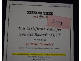 One round of golf for 4 people at the Kissing Tree Golf Course and dinner for four at the Tarbox & Brown Restaurant & Bar (4 entrees of choice and 4 desserts of choice - valid Wednesday through Friday). Golf must be played Monday through Thursday for after 1:00PM on Friday through Sunday.