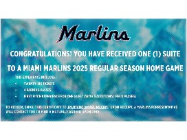 1Got a baseball lover in your life?? We have a once in a lifetime experience! Not only will you enjoy a FULL SUITE at the Marlins game (fitting 26 guests), But one lucky member of your party will get to throw out the first pitch and be accompanied w/ 3 additional field passes. You will also receive 4 parking passes! You don't want to miss out on this incredible experience.