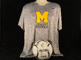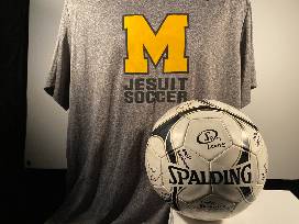 From the 2024 McQuaid Soccer team is a commemorative soccer ball autographed by the players. Go Knights! Plus, a Nike Gold and Black M Jesuit logo soccer shirt and two auto decals.