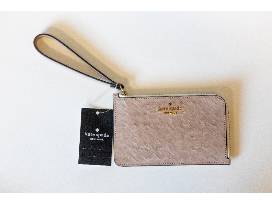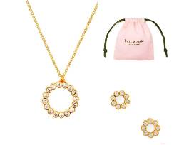 Just the right sparkle, gold color, and quality with this Kate Spade gift! Shine with the full circle mini pendant necklace and earrings. Carry your treasures in the "Lucy" toasted hazelnut "L" zip wristlet of Saffiano leather. Dust bag included (3.8" H x 9.1" W)