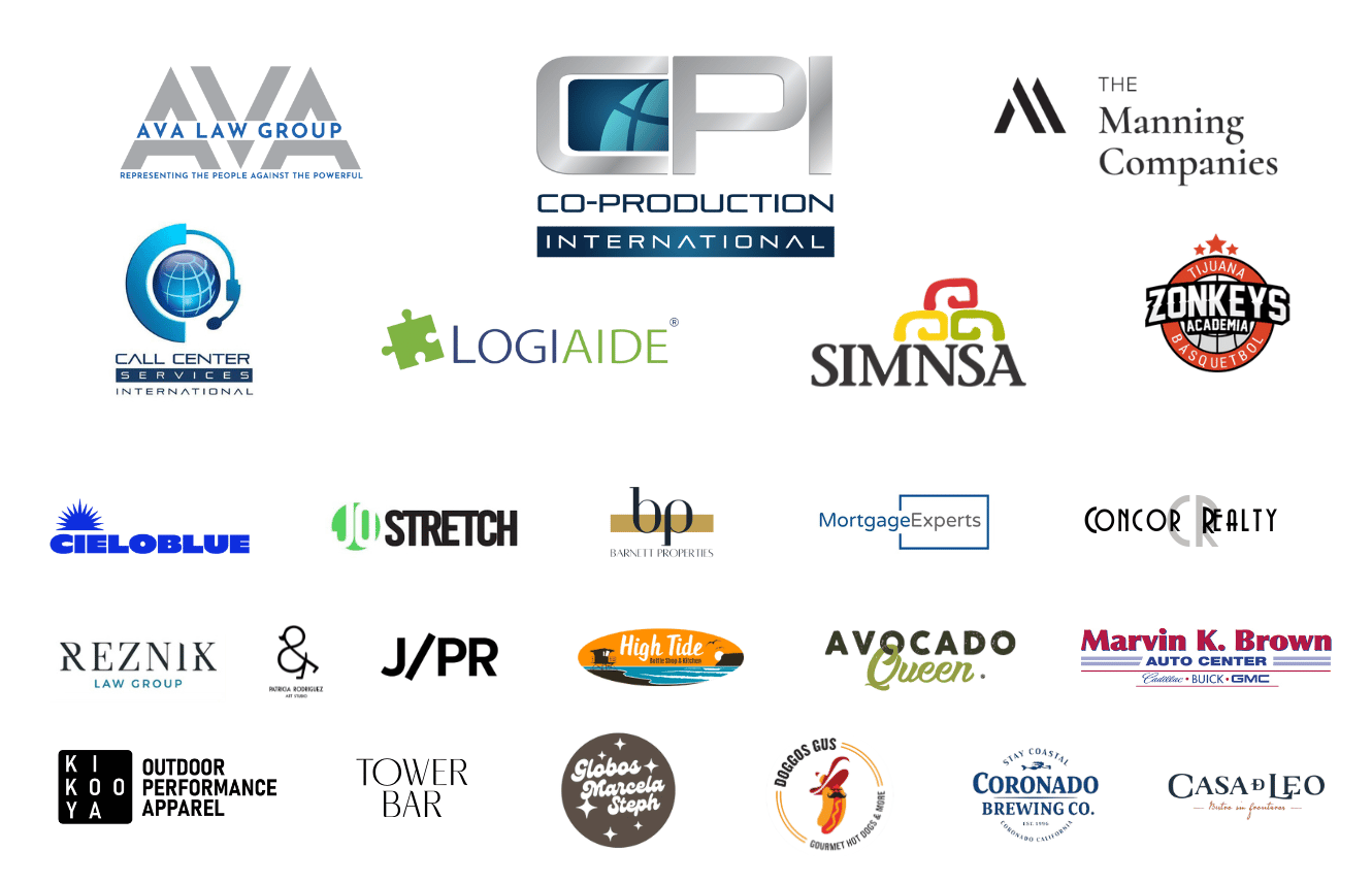 AVA Law Group | CPI Co-Production International | The Manning Companies | Call Center Services International | Logiaide | Coronado Brewing Co. | Patricia Rodriguez Art Studio | Simnsa | JoStrech | Barnett Properties | Mortgage Experts | Cielo Blue | Concor Realty | Reznik Law Group | J/PR | Avocado Queen | Marvin K. Brown Auto Center | KIKOOYA | Tower Bar | Globos Marcela Steph | Doggos Gus | Casa D Leo | Zonkeys | High Tide