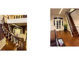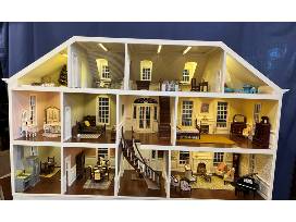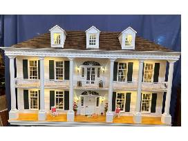 This dollhouse is a top of the line classical Southern Colonial dollhouse designed and constructed by the Lawbre Dollhouse Company. This 12 room house measures approximately 59" w, 27" d, and 35" h.. There is a curved staircase in the main entrance hall.